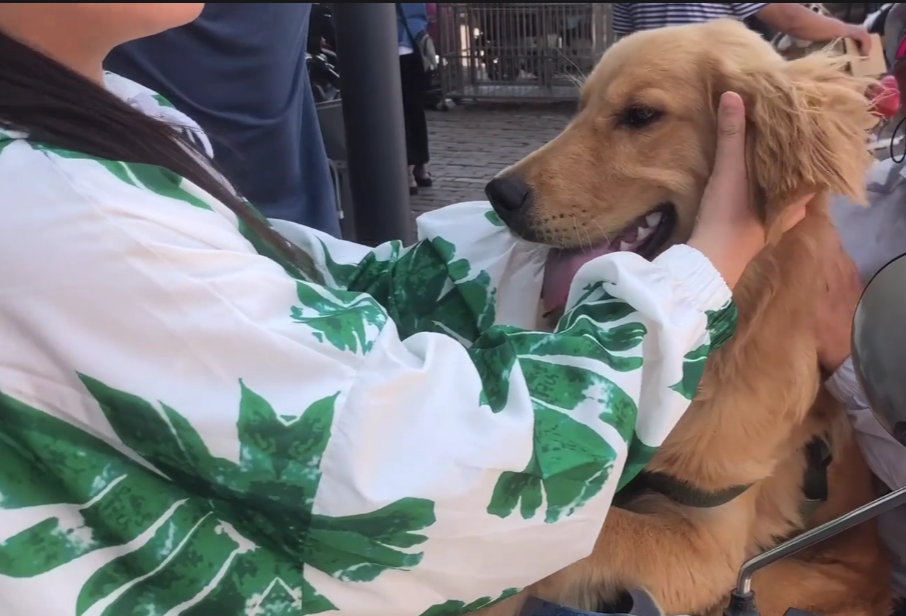 而大姐的表态似乎也让一些围观的路人不满,人群也慢慢地散开了一些,眼看人群散去,大姐也不着急,继续逗弄着自己车上的那只金毛犬,当她看见网友靠近后,又对网友说道:“俺这狗,我跟你说,只要是郑州人都知道这个狗是郑州的警队的公狗配的,6万多那条狗!”说完大姐还伸手比了个六的手势。